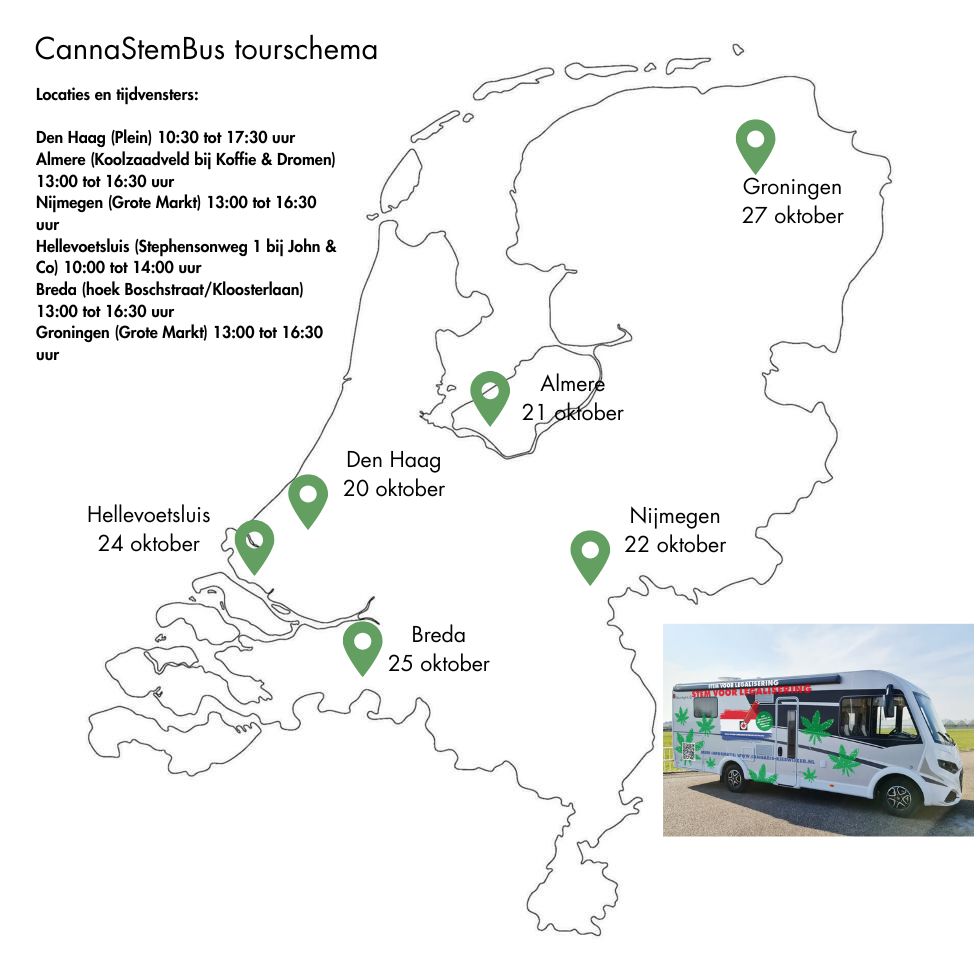 Van 20 tot en met 27 oktober 2025 organiseert de Stichting Maatschappij en Cannabis (ANBI) wederom een tour door Nederland met de CannaStembus om zoveel mogelijk cannabisconsumenten naar de stembus te krijgen bij de Tweede Kamerverkiezingen op 29 oktober a.s.